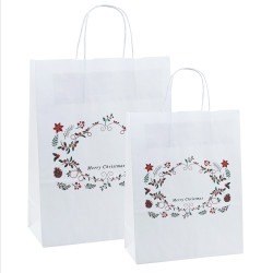 Christmas Border Carrier BagsSold packs 10 bagsBag size 320x120x420mmWhite Kraft paper carrier bagsW..